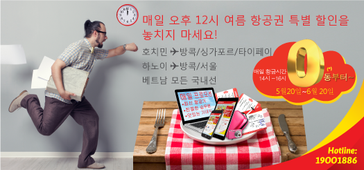 (Vietjet, 호치민시, 19/05/2015) – 비엣젯항공은 현재까지 제일 큰 프로모션을 시작했다. 매일 황금 시간인 12시 – 14시 사이에 “매일12시면, 비엣젯을 하자”란 프로모션으로 매일 특가 항공권을 제공한다. Vietjetair.com 공식 사이트에서 2016년 말까지 3 백만 장의 특가 항공권을 판매할 예정이다. 5월 20일부터 6월 20일까지, 제 1 차 특가 행사에 0동부터 시작한 5만 장의 항공권은 모든 국내선 및 싱가포르 태국, 대만, 한국행 국제선과 9월 3일부터 2015년 12월 15일 비행 기간을 적용한다.