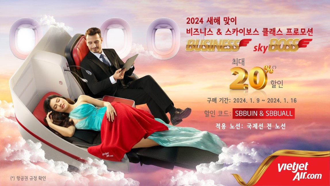 더불어 2024년 1월 16일까지 비엣젯 항공 공식 홈페이지와 모바일 앱을 통해 비엣젯 항공의 비즈니스 및 스카이보스 클래스 항공권을 특별 할인가로 제공한다. ‘SBBUIN’ 코드 입력 시 인도-베트남 직항 항공권을 20% 할인된 가격에 구입할 수 있다. 다른 국제선 항공권의 경우 ‘SBULL’ 코드를 입력해 10% 할인된 가격에 항공권을 구입할 수 있다. 해당 프로모션 항공권의 탑승 기간은 2024년 6월 30일까지이다.