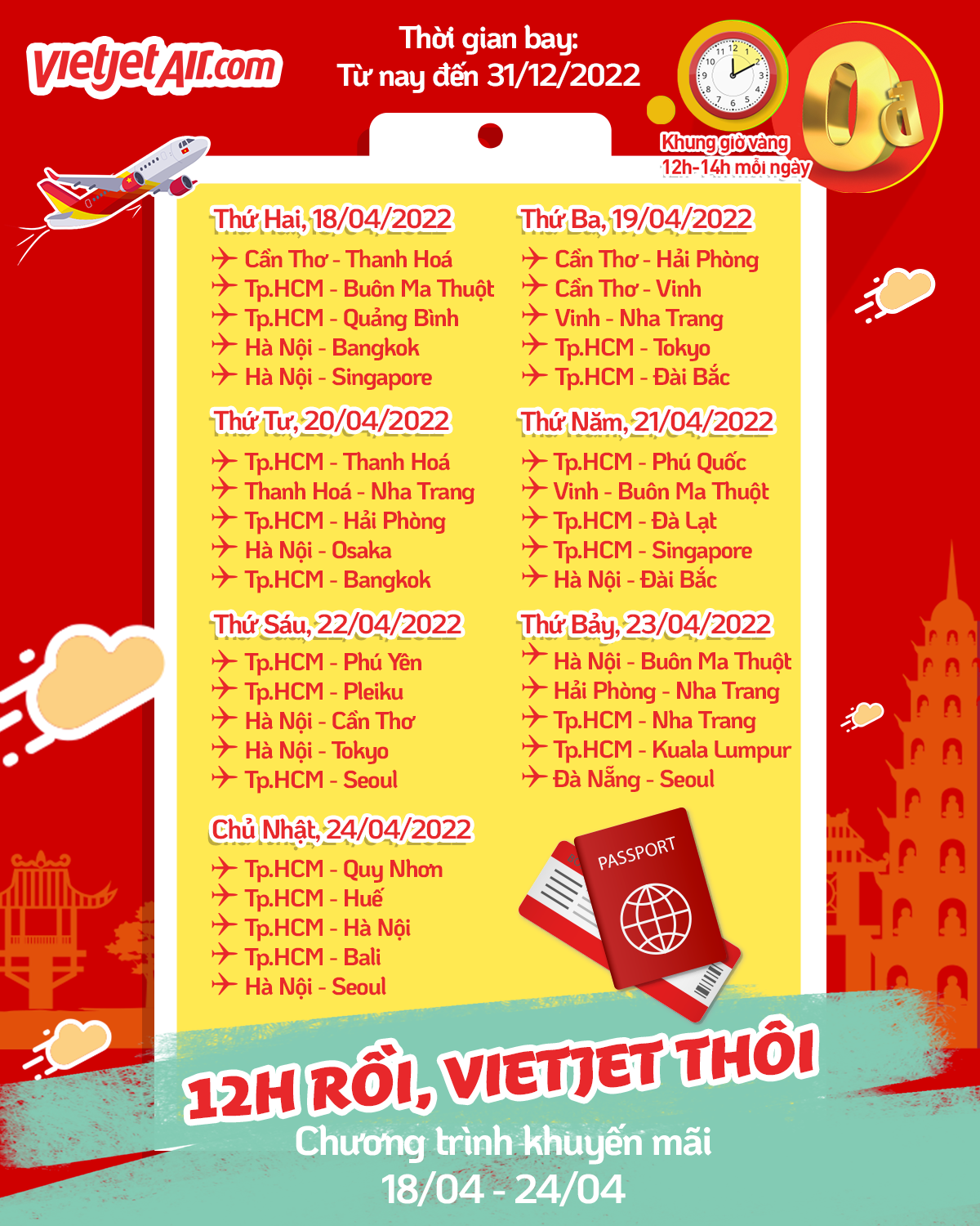 “12h rồi, Vietjet thôi” - Tuần lễ vàng săn vé 0 đồng 18/4 – 24/4/2022
