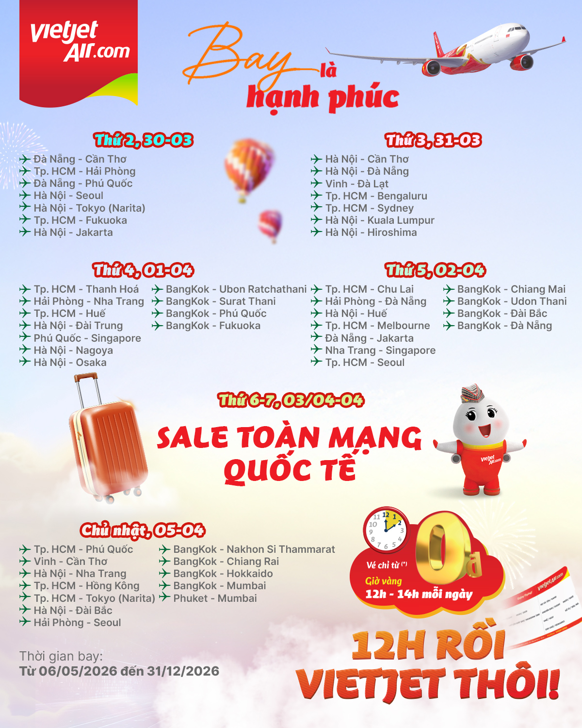 Trúng "sít rịt" không phải ngày nào cũng có. Nhưng ưu đãi giá tốt, vé bay 0đ thì Vietjet có mỗi ngày từ 12h – 14h nha. Bay khắp Việt Nam từ núi non đến biển cả, bay khắp Thế giới từ Á đến Âu, mỗi chuyến đi là một lần làm mới chính mình.
