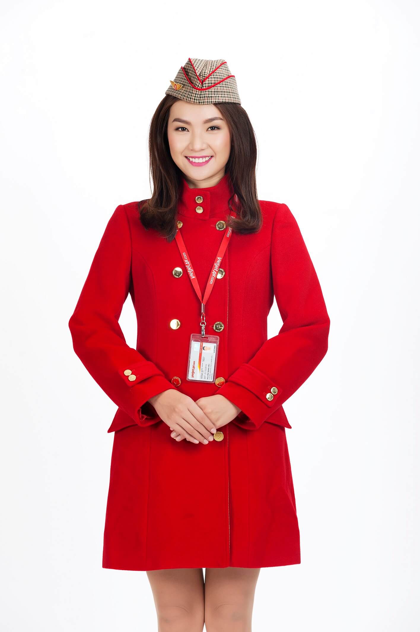 Vietjet uniforms were designed by European designers based on the ideas of the youth army cadet uniforms. For female flight attendants, stylized red T-shirts, bow ties, shorts with a plaid hat and accessories such as flying wings, badges, brown belts and the prominent pretty red shoes. In winter, the vest matches with shorts to bring the youthfulness, freshness. The male attire is not only smart but also dynamic with black trousers, business shoes and stylish red t-shirt.