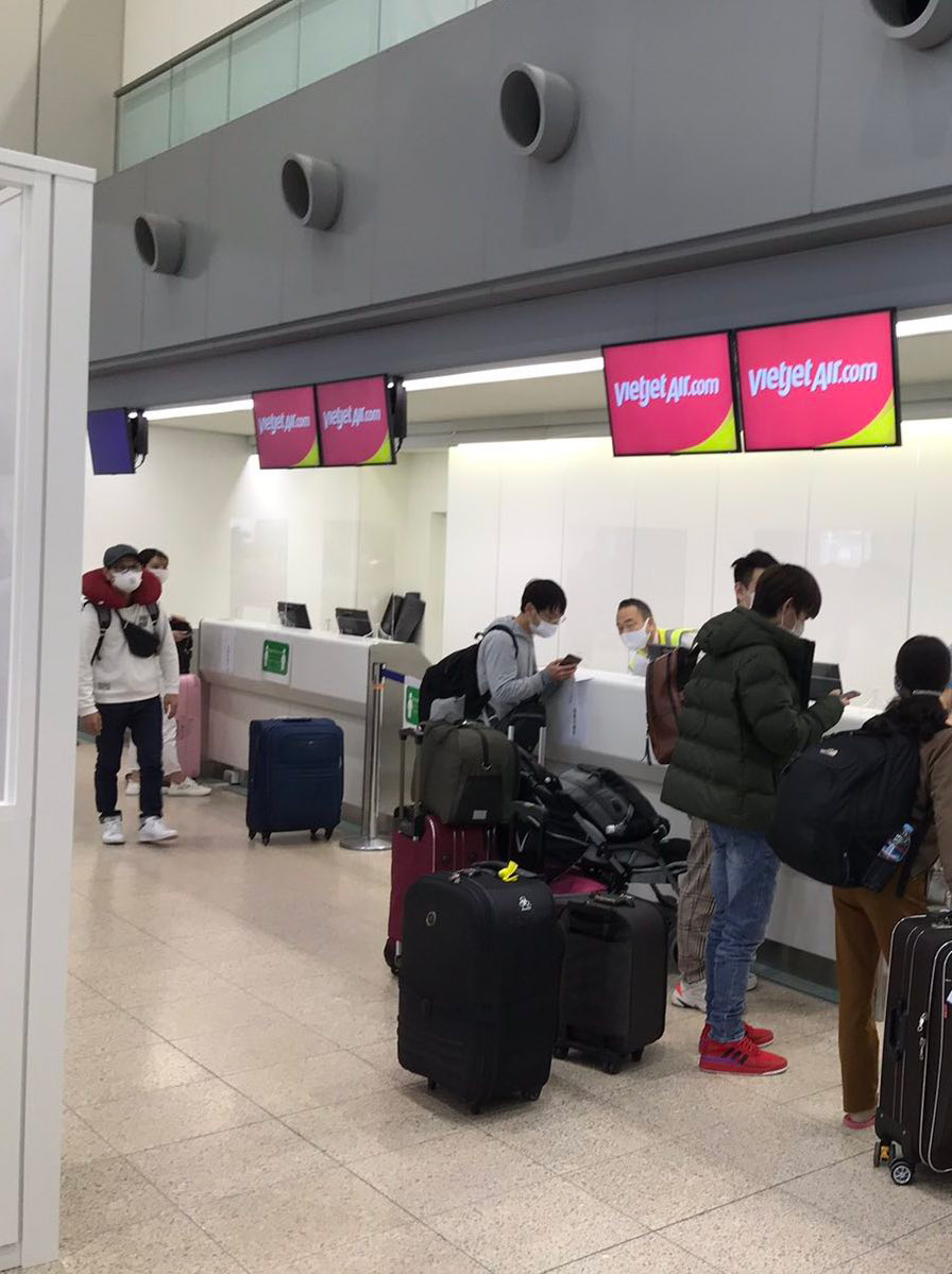 (11 月 8 日、鹿児島発のベトジェット初便に搭乗する乗客たち)