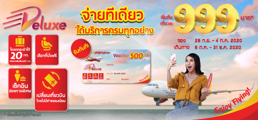 - บัตรส่วนลด มูลค่า 500 บาทสำหรับจองตั๋วแบบ Deluxe ในครั้งต่อไป โดยระบุชื่อบนบัตรส่วนลดเป็นชื่อของผู้ติดต่อ/ ผู้โดยสารหลักที่ทำการจองผ่าน SkyFUN.vietjetair.com ในช่วงเวลาที่กำหนด เท่านั้น