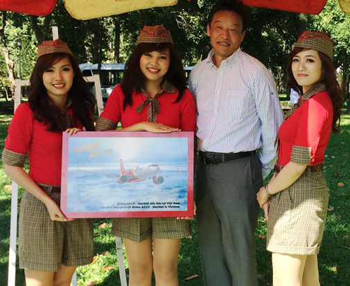 Mr. Nick Yoshida,ประธานกรรมการและซีอีโอของฝ่ายการตลาดบริษัทแคนอนเวียดนาม, พร้อมกับลูกเรือ VietJetAir,