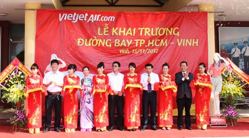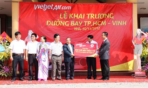 (VietJetAir เมืองโอจิมินห์ วันที่ ๑๕/๑๑/๕๕)- VietJetAir ฉลองเปิดเที่ยวบินระหว่างโฮจิมินและ วิญ เชื่อมเมืองชื่อของลุงโฮไปเมืองของท่าน นี้เป็นพื้นที่ไปที่ ๖ ของ VietJetAir กับฮานอย โฮจิมินห์ ไฮฟอง ดานัง ญาตราง ในโอกาสนี้ VietJetAir ได้บริจาค 500 หนังสือประกันสุขภาพให้คนจนจังหวัดแงอาน