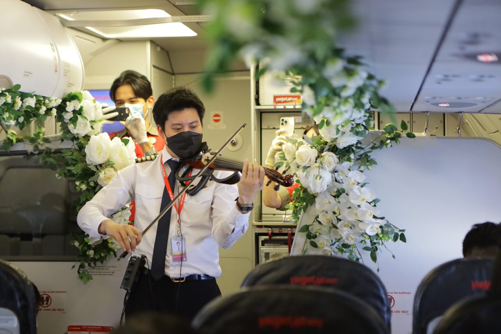 ผู้โดยสารบนเที่ยวบินพิเศษได้รับการต้อนรับด้วยเสียงไวโอลินอันไพเราะซึ่งบรรเลงโดยกัปตันของสายการบินฯ พร้อมช็อกโกแลตและการ์ดงานแต่งเป็นของที่ระลึก หลังจากเครื่องบินทะยานขึ้นสู่ท้องฟ้า เจ้าสาวเดินมาจากทางด้านหลังของเครื่องบินตามทางเดินห้องโดยสารที่ประดับด้วยดอกไม้สีขาว แสดงถึงเรื่องราวความรักอันลึกซึ้งของคู่บ่าวสาว บรรยากาศบนเที่ยวบินดังกล่าวอบอวลไปด้วยความอบอุ่นและความประทับใจ โดยเดินทางถึงปลายทาง ณ ท่าอากาศยานนานาชาติกระบี่อย่างปลอดภัย