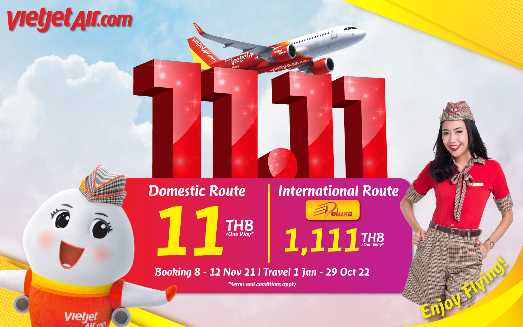 (กรุงเทพฯ, 9 พฤศจิกายน 2564) – สายการบินไทยเวียตเจ็ทฉลองมหกรรมลดกระหน่ำช็อปปิ้งออนไลน์ 11.11 เสนอบัตรโดยสารราคาพิเศษ เริ่มต้นเพียง 11 บาท สำหรับเส้นทางบินภายในประเทศ และบัตรโดยสารแบบดีลักซ์ (Deluxe) ราคาพิเศษ เริ่มต้นเพียง 1,111 บาท สำหรับเส้นทางบินระหว่างประเทศ (ราคาไม่รวมภาษีและค่าธรรมเนียม) บัตรโดยสารแบบดีลักซ์รวมน้ำหนักกระเป๋าสัมภาระเช็คอินฟรี 20 กิโลกรัม สิทธิในการเลือกที่นั่งฟรี ช่องทางพิเศษสำหรับเช็คอิน และสิทธิในการเปลี่ยนเที่ยวบินได้ไม่จำกัดจำนวนครั้งโดยไม่เสียค่าธรรมเนียม ผู้โดยสารสามารถสำรองบัตรโดยสารได้ถึงวันที่ 12 พฤศจิกายน 2564 เดินทางได้ระหว่างวันที่ 1 มกราคม - 29 ตุลาคม 2565 (ยกเว้นวันหยุดนักขัตฤกษ์) ที่ www.vietjetair.com
