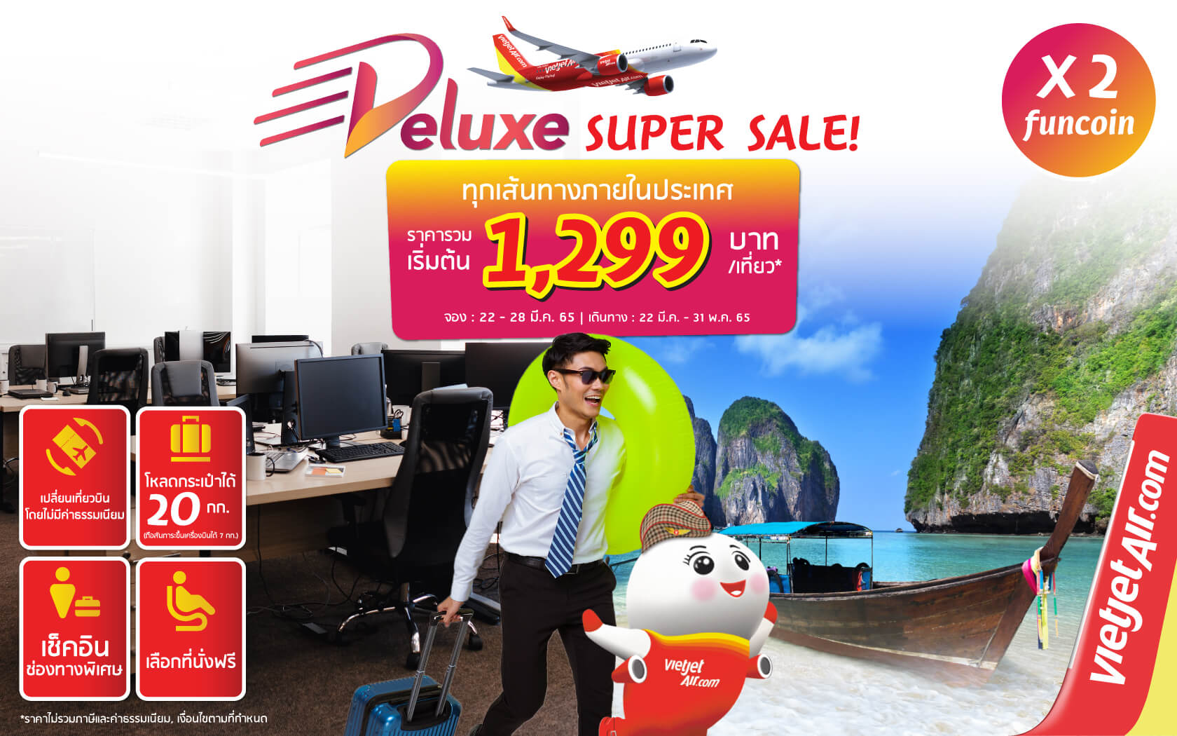 (กรุงเทพฯ, 22 มีนาคม 2565) – สายการบินไทยเวียตเจ็ทเปิดตัวโปรโมชั่นพิเศษ “ดีลักซ์ ซูเปอร์ เซลล์ (Deluxe Super Sale)” เสนอบัตรโดยสารแบบดีลักซ์ราคาพิเศษ เริ่มต้นเพียง 1,299 บาท (ราคารวมภาษีและค่าธรรมเนียม) สำหรับเดินทางบนทุกเส้นทางบินบนเครือข่ายเส้นทางบินภายในประเทศของไทยเวียตเจ็ท บัตรโดยสารแบบดีลักซ์รวมน้ำหนักกระเป๋าสัมภาระเช็คอินฟรี 20 กิโลกรัม สิทธิในการเลือกที่นั่งฟรี ช่องทางพิเศษสำหรับเช็คอิน และสิทธิในการเปลี่ยนเที่ยวบินได้ไม่จำกัดจำนวนครั้งโดยไม่เสียค่าธรรมเนียม ผู้โดยสารสามารถสำรองบัตรโดยสารได้ถึงวันที่ 28 มีนาคม 2565 เดินทางได้ระหว่างวันที่ 22 มีนาคม - 31 พฤษภาคม 2565 (ยกเว้นวันหยุดนักขัตฤกษ์) ที่ www.vietjetair.com