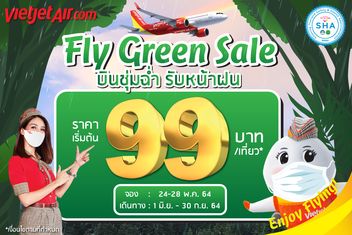 (กรุงเทพฯ, 24 พฤษภาคม 2564) – สายการบินไทยเวียตเจ็ทต้อนรับฤดูฝน เปิดตัวโปรโมชั่น ‘Fly Green Sale บินชุ่มฉ่ำ รับหน้าฝน’ เสนอบัตรโดยสารราคาพิเศษ เริ่มต้นเพียง 99 บาท (ราคาไม่รวมภาษี ค่าธรรมเนียม และบริการเสริมพิเศษ) สำหรับเดินทางในทุกเส้นทางบินภายในประเทศของสายการบินฯ สามารถจองได้ตั้งแต่วันที่ 24 – 28 พฤษภาคม 2564 เดินทาง 1 มิถุนายน – 30 กันยายน 2564 (ยกเว้นวันหยุดนักขัตฤกษ์) ที่ www.vietjetair.com