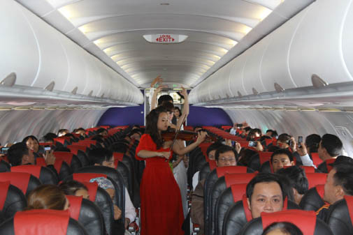 ผู้โดยสารกำลังรอค่อยเห็ตุการณ์ที่ยอดฮอตและโปรเกรมโปรโมชันที่น่าสนใจ เซอไพรซ์ ในการเปิดเส้นทางบินต่อไปของ VietJetAir.