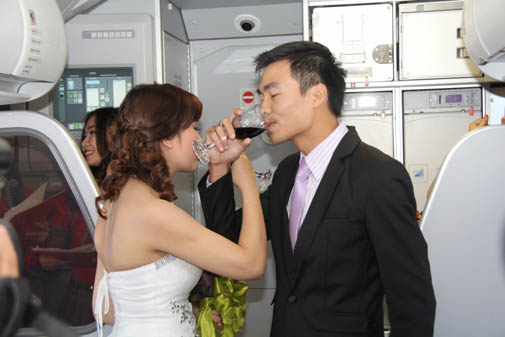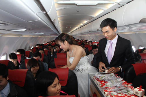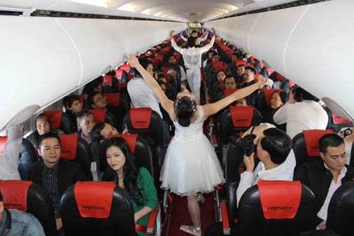 ถ้าหากชาวอเมริกันเคยทำให้ซ็อกโดยพิธีแต่งงานบนยอกเขาเซเนกามีความสูงเกือบ ๓๐๐ ม. ของเอวีงส์และอันโทนฮอดจ์เอวีงส์ ชาวจีนเคยกลายเป็นยอดฮิตโดยการแต่งงานในป่าลึกของเจ้าบ่าวยางฮัวและเจ้าสาวแปงยู หรือ การแต่งงานใต้น้ำของคู่รักที่จี่หนานวันที่ ๑๙ มืถุนายนที่ผ่านมา ถึงวันนี้การแต่งงานของคู้รักบนเครื่องบินของสายการบิน VietJetAirในเวียดนามได้ทำให้ปลุกหัวใจของคนกำงลังรักกันและกลายเป็นหัวข้อที่ยอดฮิตออนไลน์ มีผู้เข้าชมหลายแสน