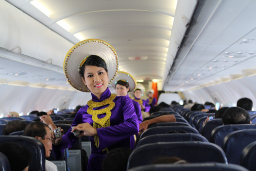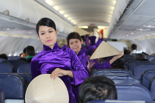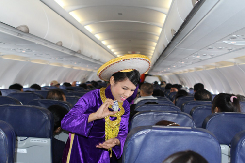นาย Duong Chau Toan พร้อมด้วยพนักงานต้อนรับบนเครื่องบินแจกจ่ายงอบพื้นเมืองแก่ผู้โดยสาร