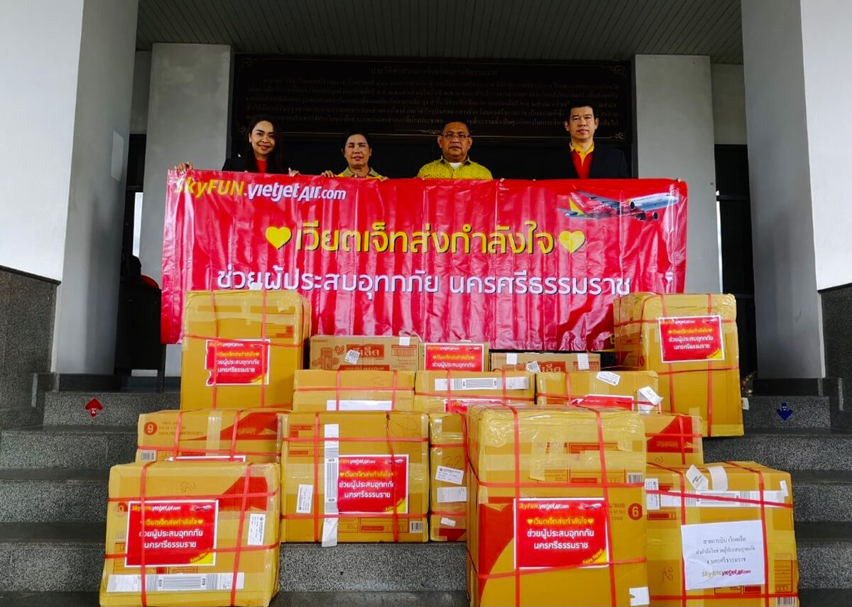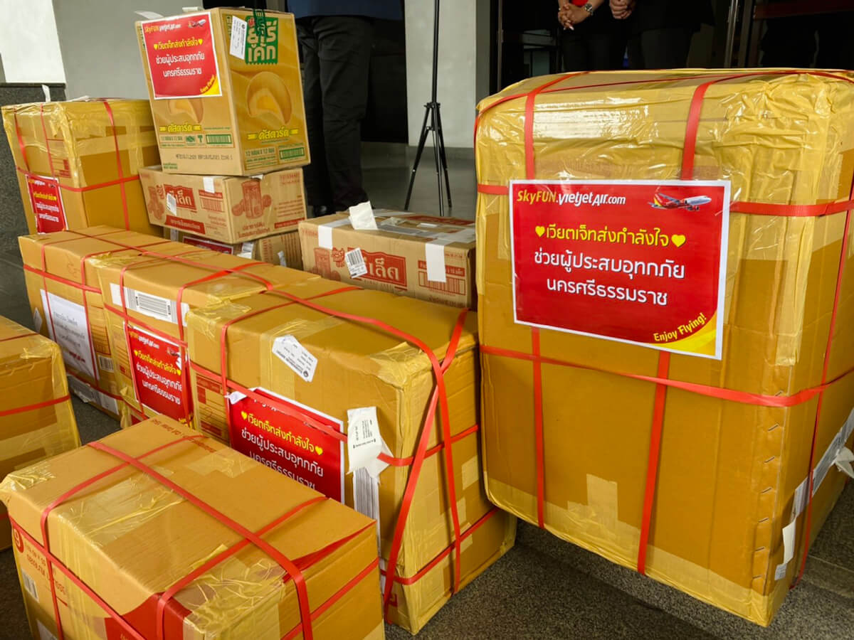 กรุงเทพฯ, 8 ธันวาคม 2563 – สายการบินไทยเวียตเจ็ทเข้าพบผู้ว่าราชการจังหวัดนครศรีธรรมราช นายไกรศร วิศิษฎ์วงศ์ เพื่อส่งมอบสิ่งของบริจาคช่วยเหลือผู้ประสบอุทกภัยล็อตแรก หลังจากที่ทางสายการบินได้จัดตั้งจุดรับบริจาคสิ่งของที่ท่าอากาศยานสุวรรณภูมิ ตั้งแต่วันที่ 3 ธันวาคม 2563 นอกจากนี้ทางสายการบินยังได้ส่งมอบอาหารและน้ำดื่ม จำนวน 100 ชุด ให้กับเจ้าหน้าที่ของท่าอากาศยานนครศรีธรรมราช ซึ่งได้รับผลกระทบจากอุทกภัย ทำให้ขาดแคลนอาหารและเครื่องดื่มสำหรับผู้ปฏิบัติงานภายในท่าอากาศยานนครศรีธรรมราช โดยมี นายถาวร แสงอำไพ ผู้อำนวยการท่าอากาศยานนครศรีธรรมราช เป็นผู้รับมอบเมื่อวันที่ 4 ธันวาคมที่ผ่านมา