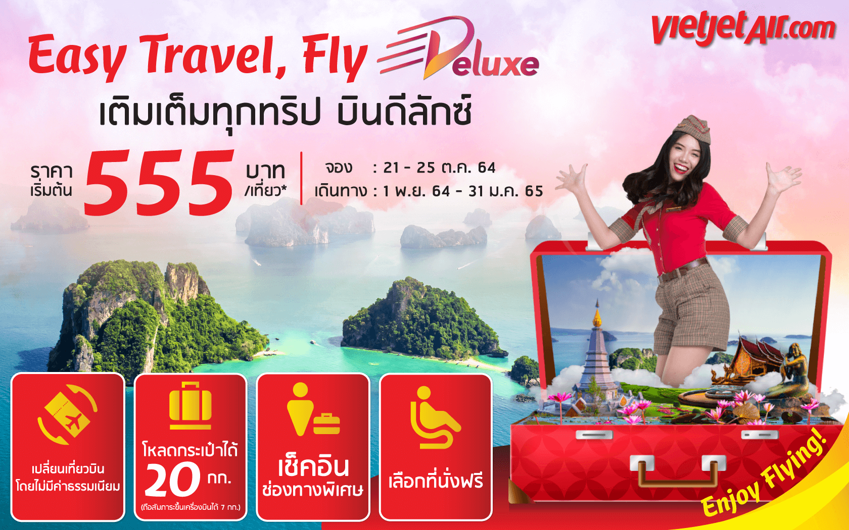 (กรุงเทพฯ, 21 ตุลาคม 2564) – สายการบินไทยเวียตเจ็ทเปิดตัวโปรโมชั่น “Easy Travel, Fly Deluxe” เสนอบัตรโดยสารแบบดีลักซ์ (Deluxe) ราคาพิเศษ เริ่มต้นเพียง 555 บาท สำหรับเส้นทางบินภายในประเทศ และ 999 บาท สำหรับเส้นทางบินระหว่างประเทศ (ราคาไม่รวมภาษีและค่าธรรมเนียม) บัตรโดยสารแบบดีลักซ์ราคาพิเศษนี้รวมน้ำหนักกระเป๋าสัมภาระเช็คอินฟรี 20 กิโลกรัม สิทธิในการเลือกที่นั่งฟรี ช่องทางพิเศษสำหรับเช็คอิน และสิทธิในการเปลี่ยนเที่ยวบินได้ไม่จำกัดจำนวนครั้งโดยไม่เสียค่าธรรมเนียม จองได้ตั้งแต่วันที่ 21 – 25 ตุลาคม 2564 เดินทางได้ตั้งแต่วันที่ 1 พฤศจิกายน 2564 – 31 มกราคม 2565 (ยกเว้นวันหยุดนักขัตฤกษ์) ที่ www.vietjetair.com