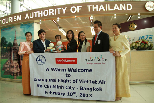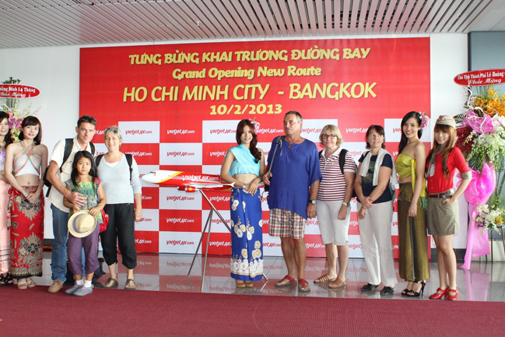 เที่ยวบินปฐมฤกษ์นี้ เดินทางจากไซ่ง่อนไปยังกรุงเทพฯ ของสายการบิน VietJetAir ได้จอดเทียบท่าที่ท่าอากาศยานสุวรรณภูมิ กรุงเทพฯ ซึ่งเป็นสนามบินที่ทันสมัยและใหญ่ที่สุดของประเทศ คณะผู้บริหารของสายการบิน Vietjet Air และผู้โดยสารได้รับการต้อนรับอย่างอบอุ่นจาก สำนักงานการท่องเที่ยวแห่งประเทศไทย (ททท.) และบริษัท บางกอกไฟลท์เซอร์วิส ที่ออกมาต้อนรับ มอบดอกไม้และของที่ระลึกให้