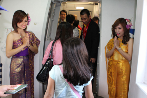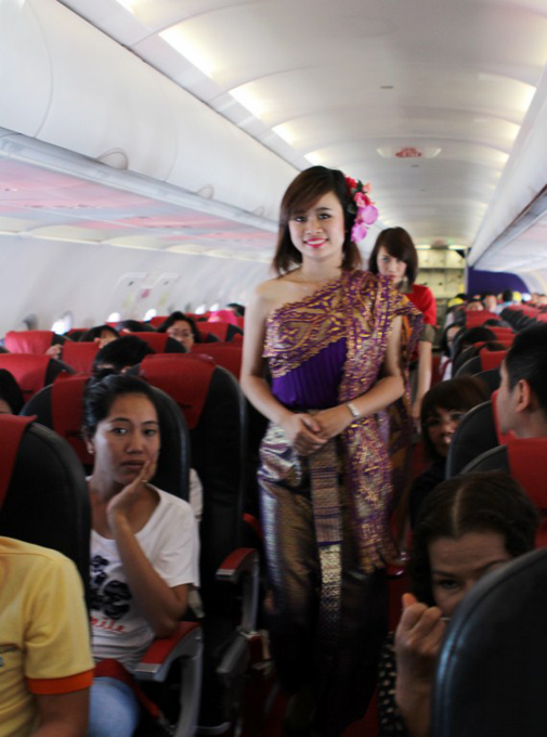 ตั้งแต่ผู้โดยสารก้าวขึ้นเครื่องบิน ก็ได้รับการต้อนรับอย่างอบอุ่นและเป็นมิตรจากสายการบิน VietjetAir โดยพนักงานต้อนรับแต่งกายด้วยชุดไทยโบราณแล้วยังเพลินเพลินกับเสียงดนตรี