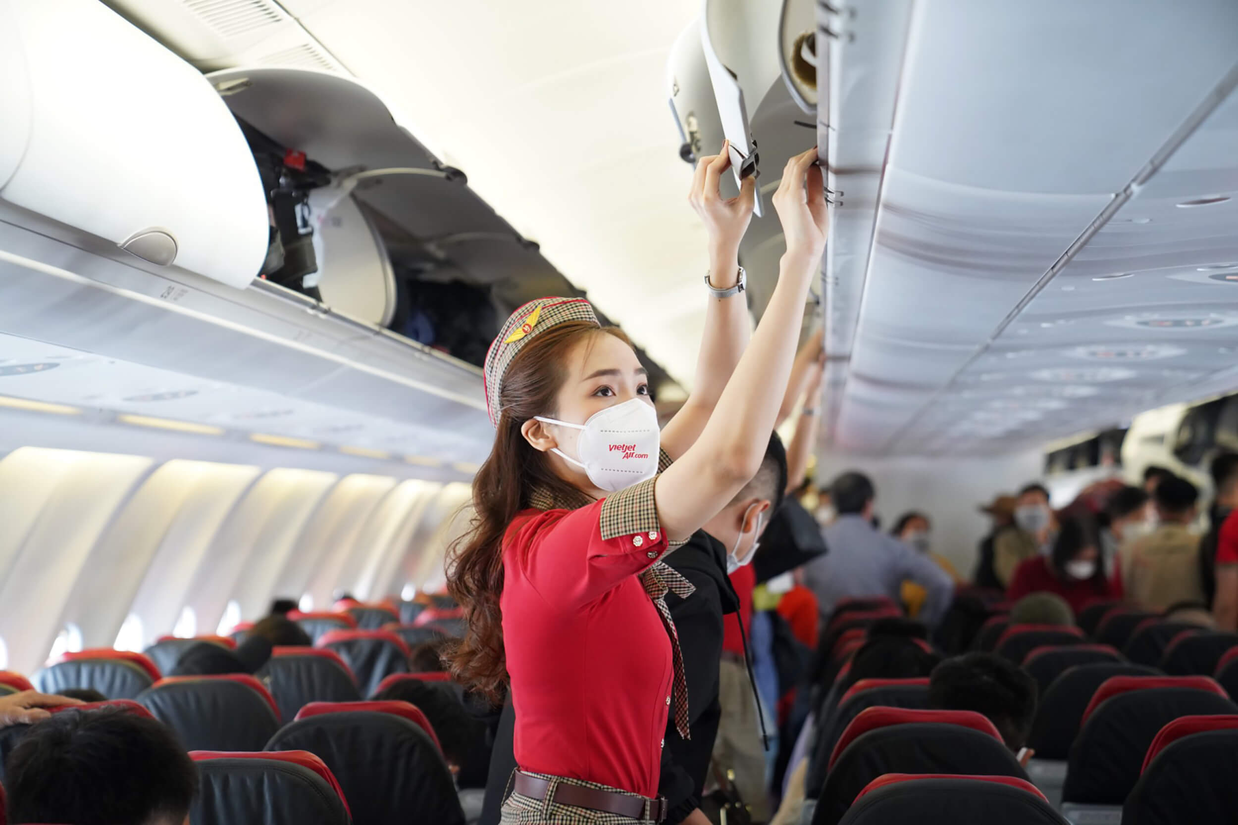 พนักงานต้อนรับบนเครื่องบินของสายการบินเวียตเจ็ททำการตรวจสอบช่องเก็บสัมภาระเหนือศีรษะ