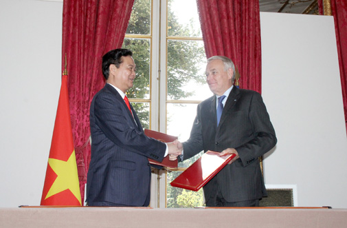 นายกรัฐมนตรีแห่งฝรั่งเศส นาย Jean-Marc Ayraultและนายกรัฐมนตรีแห่งเวียดนาม นาย Nguyen Tan Dung แลกเปลี่ยนสัญญาซึ่งกันและกัน