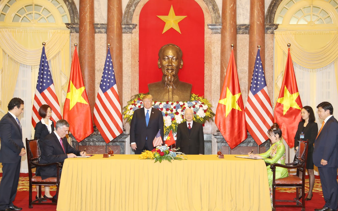 ภาพข่าว: นายเหงียน ฟู้ จ่อง ประธานาธิบดีเวียดนาม และนายโดนัลด์ ทรัมป์ ประธานาธิบดีสหรัฐฯ ร่วมเป็นสักขีพยานในพิธีลงนามสัญญาจัดซื้อเครื่องบิน ระหว่างนางเหวียน ถิ เฟือง เถา ประธานเจ้าหน้าที่บริหาร สายการบินเวียตเจ็ท และ นายเควิน แมคอัลลิสเตอร์ ประธานกรรมการและประธานเจ้าหน้าที่ฝ่ายบริหาร บริษัท โบอิ้ง คอมเมอร์เชียล แอร์เพลน จำกัด