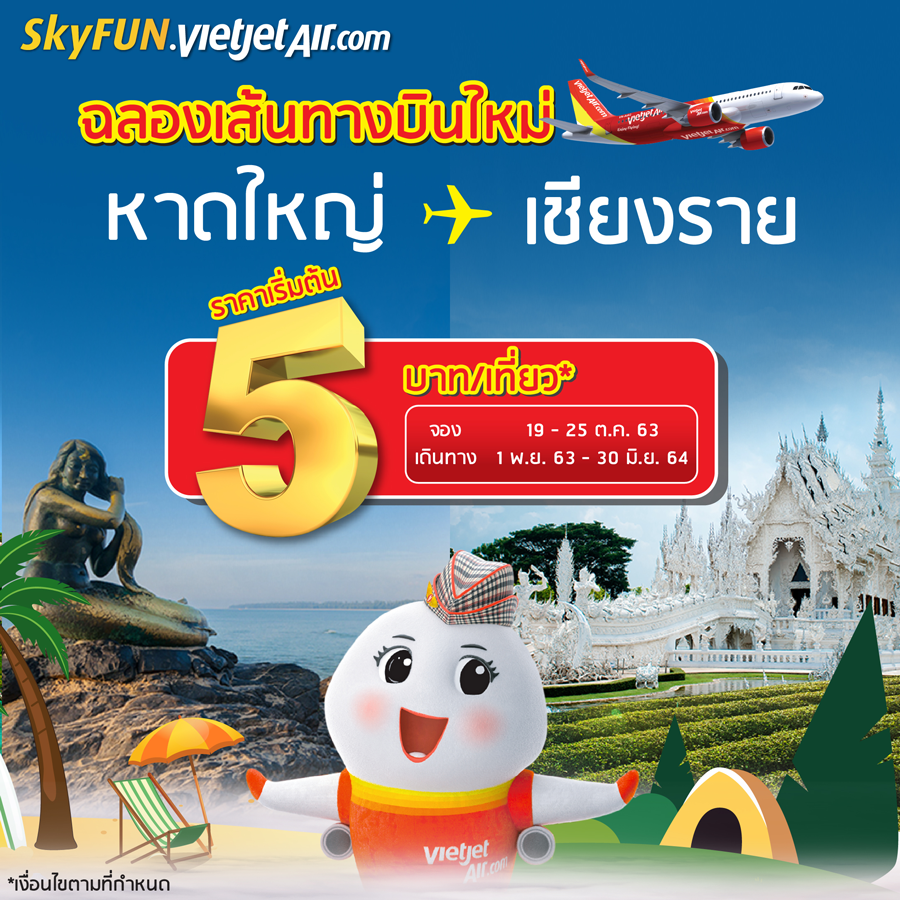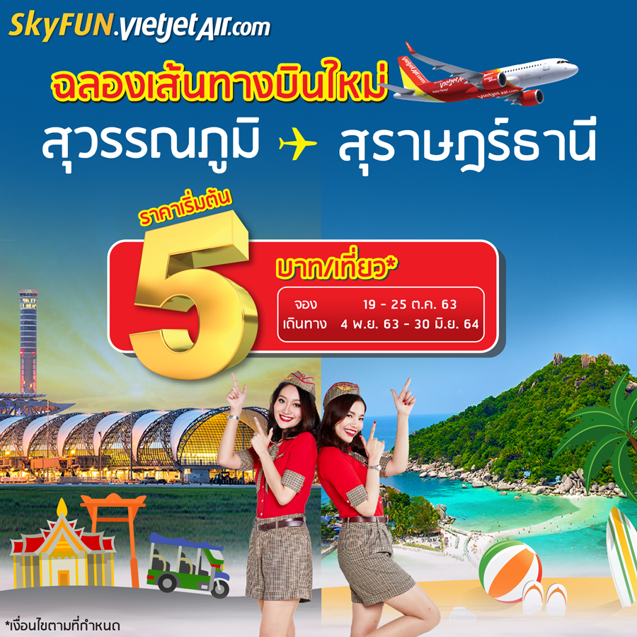 กรุงเทพฯ, 18 ตุลาคม 2563 – สายการบินไทยเวียตเจ็ทเดินหน้าขยายเครือข่ายเส้นทางบินอย่างต่อเนื่อง จากสุวรรรณภูมิ สู่ สุราษฎร์ธานี (เริ่มบิน 4 พ.ย. 2563) และเส้นทาง เชียงราย สู่หาดใหญ่ (เริ่มบิน 1 พ.ย. 2563) พร้อมจัดโปรโมชั่นตั๋วเครื่องบินราคาพิเศษเริ่มต้นเพียง 5 บาท (ไม่รวมภาษีและค่าธรรมเนียม) เปิดให้จองตั้งแต่วันที่ 19 – 25 ตุลาตม 2563 ที่เว็บไซต์ SkyFUN.vietjetair.com สำหรับใช้เดินทางได้ตั้งแต่วันที่ 1 พฤศจิกายน 2563 - 30 มิถุนายน 2564 (ไม่รวมวันหยุดนักขัตฤกษ์) ด้วยเครือข่ายการบินที่กว้างขวางของสายการบินไทยเวียตเจ็ท ผู้โดยสารสามารถเดินทางได้ง่ายและสะดวกยิ่งขึ้น จากสุวรรณภูมิไปยังจุดหมายปลายทางในประเทศถึง 10 เส้นทาง ได้แก่ เชียงใหม่ เชียงราย ภูเก็ต กระบี่ อุดรธานี หาดใหญ่ ขอนแก่นนครศรีธรรมราช อุบลราชธานี และสุราษฎร์ธานี และ เส้นทางบินตรงจาก เชียงรายสู่ภูเก็ต และหาดใหญ่ ในราคาที่คุ้มค่าและตารางเวลาการเดินทางที่สะดวกสบาย