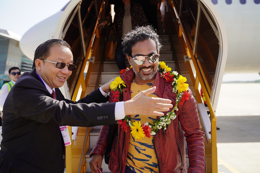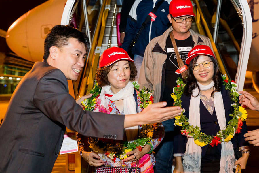นายโด๋ ซวน กวาง รองประธานกรรมการเวียตเจ็ท ต้อนรับผู้โดยสารในเที่ยวบินปฐมฤกษ์จากสิงคโปร์สู่สนามบินนานาชาติดานัง