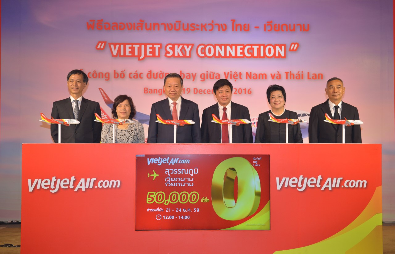 กรุงเทพฯ 19 ธันวาคม 2559 – สายการบินเวียตเจ็ทเปิดตัวแคมเปญใหม่ “สกาย คอนเนคชั่น ไทย-เวียดนาม 2017” โดยมีจุดประสงค์เพื่อส่งเสริมการเดินทางท่องเที่ยวระหว่างไทยและเวียดนามในปีที่กำลังจะมาถึง โดยพิธีเปิดตัวแคมเปญได้รับเกียรติจาก (จากซ้ายไปขวา) ฯพณฯ เหวียน ตั๊ด ถั่น เอกอัคราชทูตสาธารณรัฐสังคมนิยมเวียดนามประจำประเทศไทย มาดาม เหวียน ถิ ทาน ฮา ประธานเวียตเจ็ทกรุ๊ป ดร. เหวียน ทาน ฮุง รองประธาน เวียตเจ็ทกรุ๊ป ฯพณฯ ท่าน โต ลัม รัฐมนตรีว่าการกระทรวงมหาดไทย สาธารณรัฐสังคมนิยมเวียดนาม รศ. ดร. ชวนีย์ ทองโรช ผู้ช่วยรัฐมนตรี กระทรวงการท่องเที่ยวและกีฬา และ พลตำรวจโท ศักดา ชื่นภักดี ผู้ช่วย ผบ.ตร.