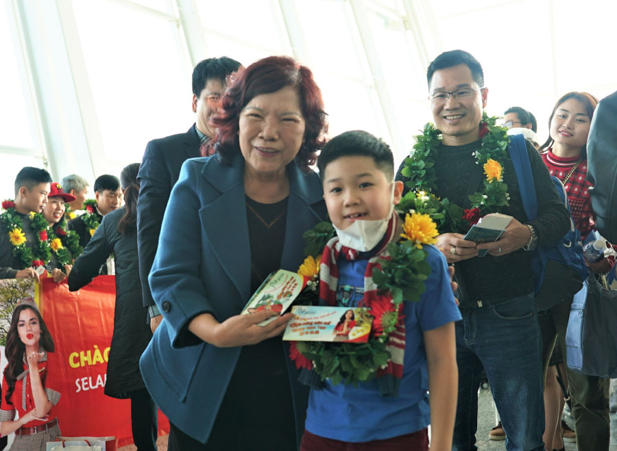 นางเหวียน แทง ฮา ประธานคณะกรรมการบริษัท เวียตเจ็ท (กลาง - เสื้อเขียว) ร่วมด้วย นายเดือง ฮวาย นัม ผู้อำนวยการฝ่ายพาณิชย์ภาคเหนือ เวียตเจ็ท ให้การต้อนรับลูกเรือและผู้โดยสารในเที่ยวบินปฐมฤกษ์