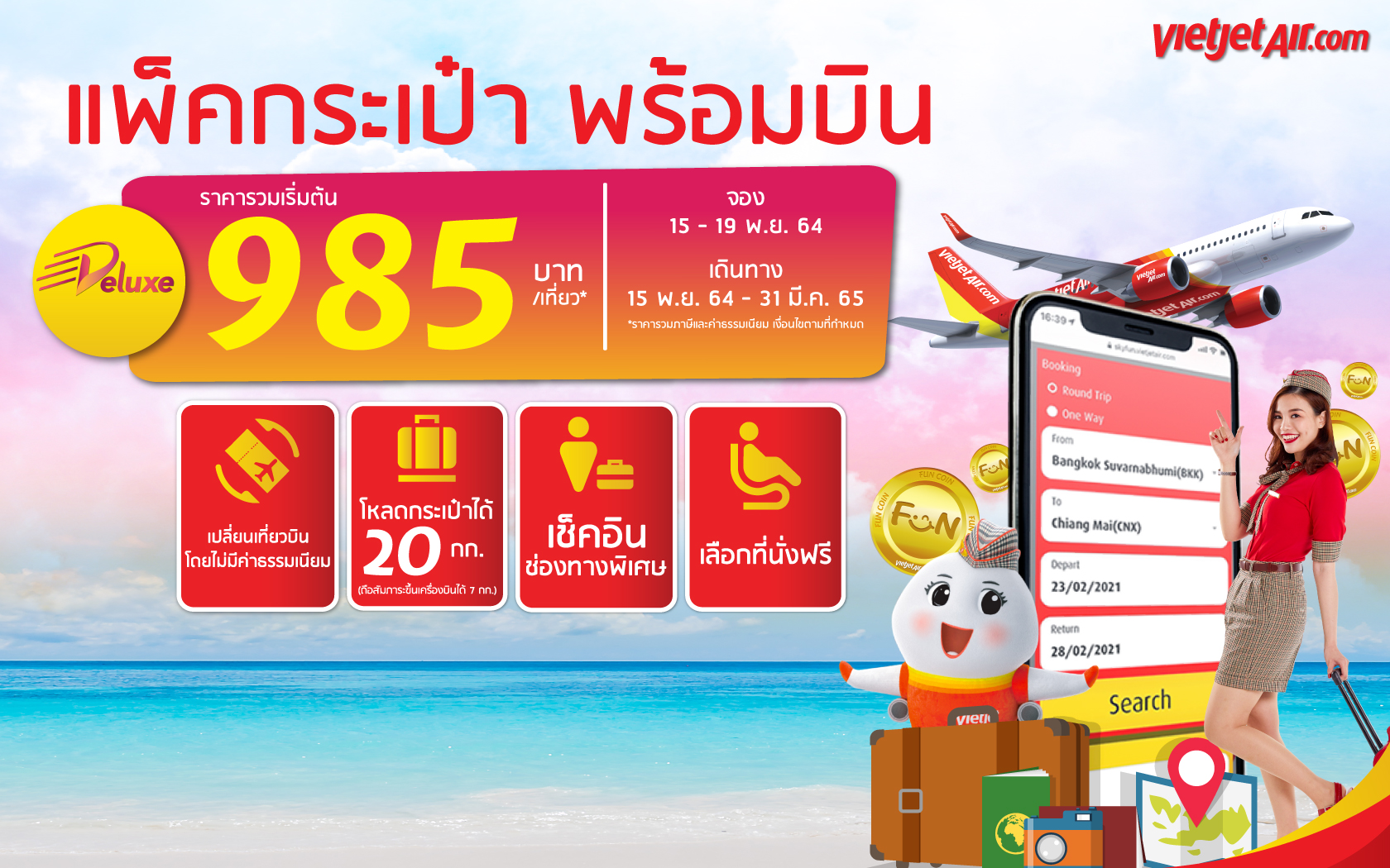 (กรุงเทพฯ, 15 พฤศจิกายน 2564) – สายการบินไทยเวียตเจ็ทฉลองต้อนรับฤดูกาลท่องเที่ยว เปิดตัวโปรโมชั่นพิเศษ “แพ็คกระเป๋า พร้อมบิน” เสนอบัตรโดยสารแบบดีลักซ์ (Deluxe) ราคาพิเศษ เริ่มต้นเพียง 985 บาท (ราคารวมภาษีและค่าธรรมเนียม) สำหรับเดินทางในทุกเส้นทางบินบนเครือข่ายเส้นทางบินภายในประเทศของไทยเวียตเจ็ท บัตรโดยสารแบบดีลักซ์รวมน้ำหนักกระเป๋าสัมภาระเช็คอินฟรี 20 กิโลกรัม สิทธิในการเลือกที่นั่งฟรี ช่องทางพิเศษสำหรับเช็คอิน และสิทธิในการเปลี่ยนเที่ยวบินได้ไม่จำกัดจำนวนครั้งโดยไม่เสียค่าธรรมเนียม ผู้โดยสารสามารถสำรองบัตรโดยสารได้ถึงวันที่ 19 พฤศจิกายน 2564 เดินทางได้ระหว่างวันที่ 15 พฤศจิกายน 2564 - 31 มีนาคม 2565 (ยกเว้นวันหยุดนักขัตฤกษ์) ที่ www.vietjetair.com