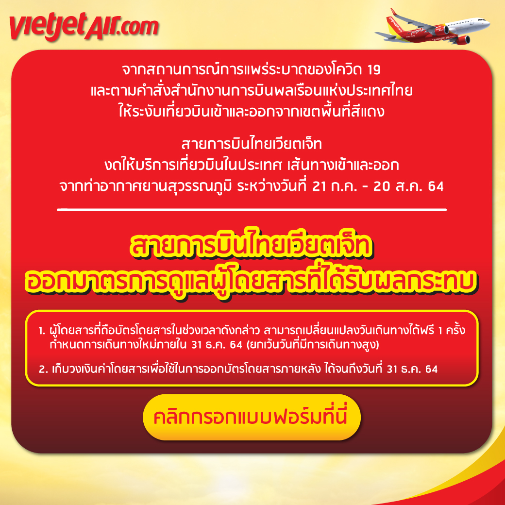 (กรุงเทพฯ – 13 สิงหาคม 2564) – สืบเนื่องจากสถานการณ์การแพร่ระบาดของโรคไวรัสโควิด-19 ที่ดำเนินไปอย่างต่อเนื่อง สายการบินไทยเวียตเจ็ทจำเป็นต้องหยุดให้บริการเที่ยวบินภายในประเทศเป็นการชั่วคราว จนถึงวันที่ 20 สิงหาคม 2564 ตามประกาศของสำนักงานการบินพลเรือนแห่งประเทศไทย ว่าด้วยแนวปฏิบัติสำหรับผู้ดำเนินการสนามบินและผู้ดำเนินการเดินอากาศในเส้นทางบินภายในประเทศ ในระหว่างสถานการณ์การแพร่ระบาดของโรคไวรัสโควิด-19 โดยสายการบินฯ จะติดตามสถานการณ์อย่างใกล้ชิด และจะแจ้งให้ผู้โดยสารทุกท่านหากมีประกาศเปลี่ยนแปลงเพิ่มเติม