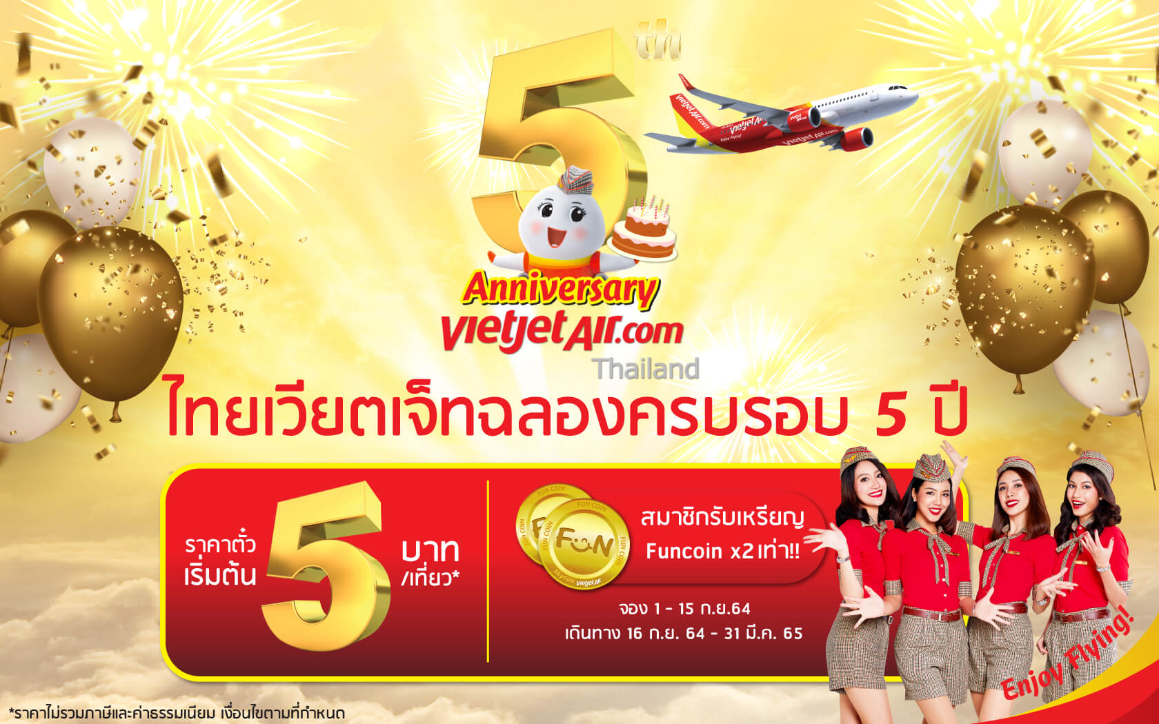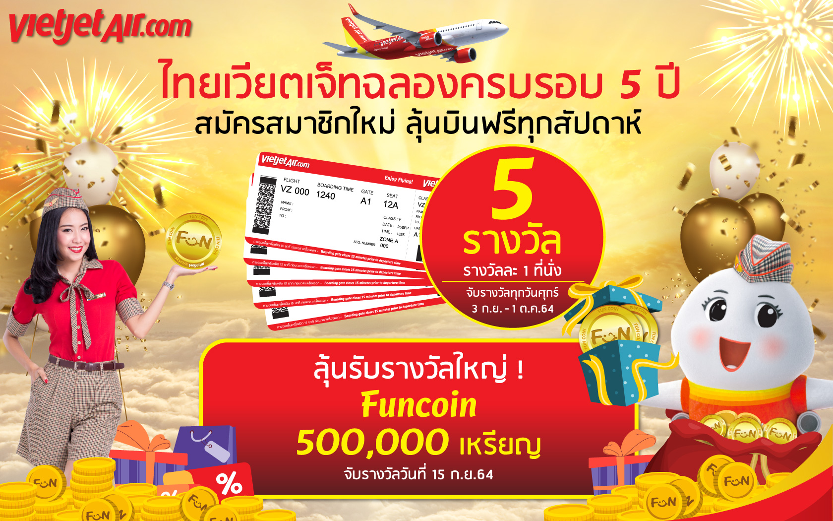 (กรุงเทพฯ, 1 กันยายน 2564) – สายการบินไทยเวียตเจ็ทเปิดตัวกิจกรรมสุดยิ่งใหญ่ ฉลองครอบรอบ 5 ปี จัดกิจกรรมลุ้นรางวัลต่อเนื่อง 5 สัปดาห์ สำหรับสมาชิกใหม่ “สกายฟันเนอร์ (SkyFUNNER)” พร้อมออกโปรโมชั่นบัตรโดยสารภายในประเทศราคาพิเศษ เริ่มต้นเพียง 5 บาท