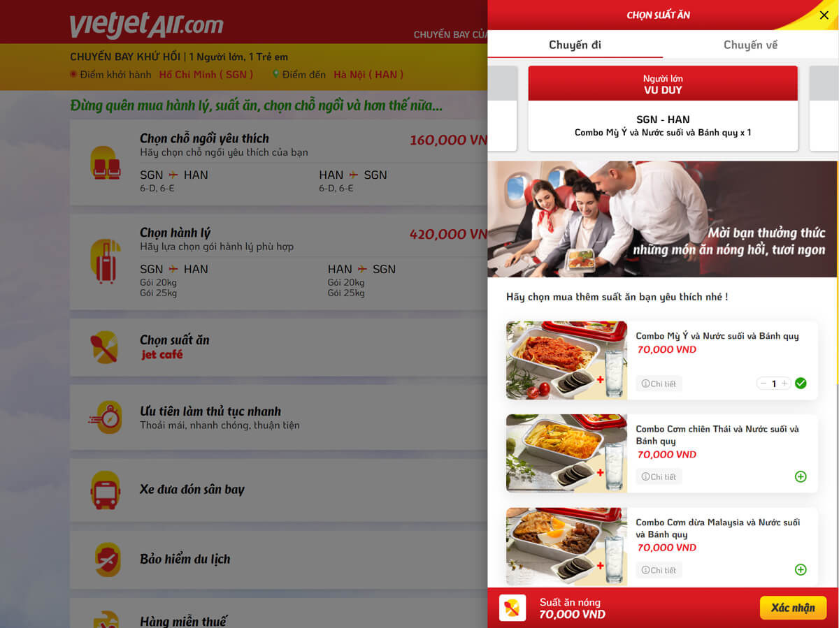 Bước 4: Chọn mua dịch vụ bổ sung, bao gồm dịch vụ đặt trước suất ăn: Nhấn dấu + để chọn món ăn, nhấn tiếp + hoặc - để tăng giảm số lượng suất ăn, cuối cùng nhấn “Xác nhận”.
