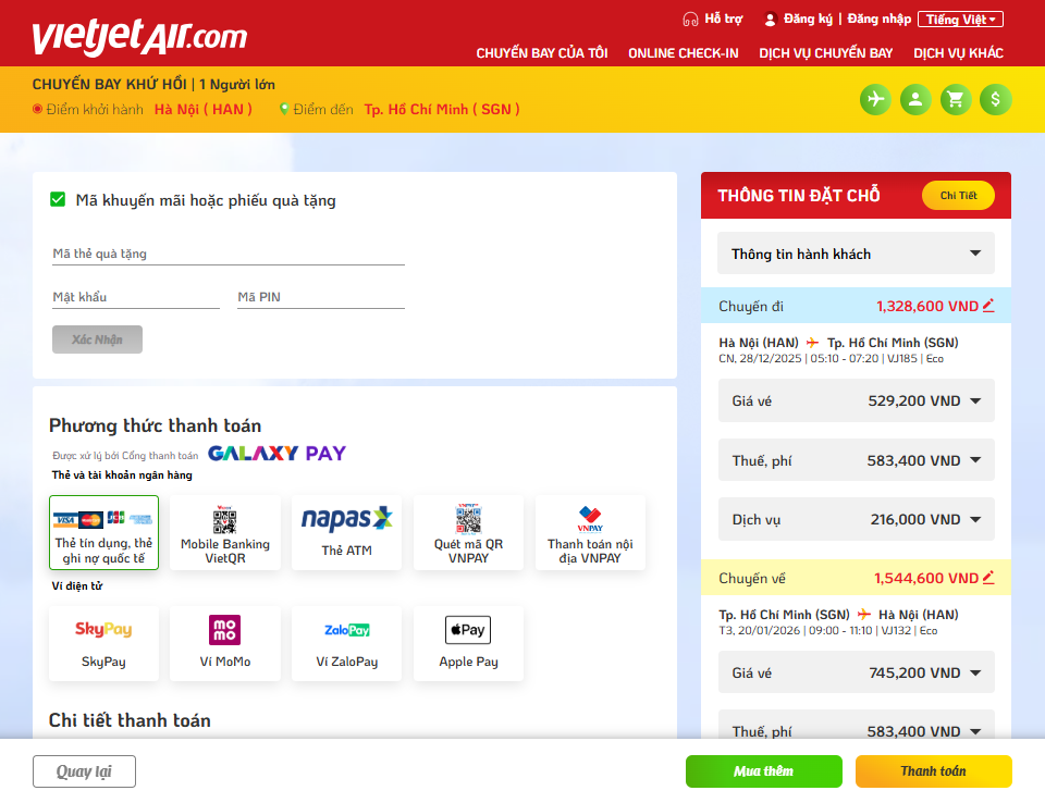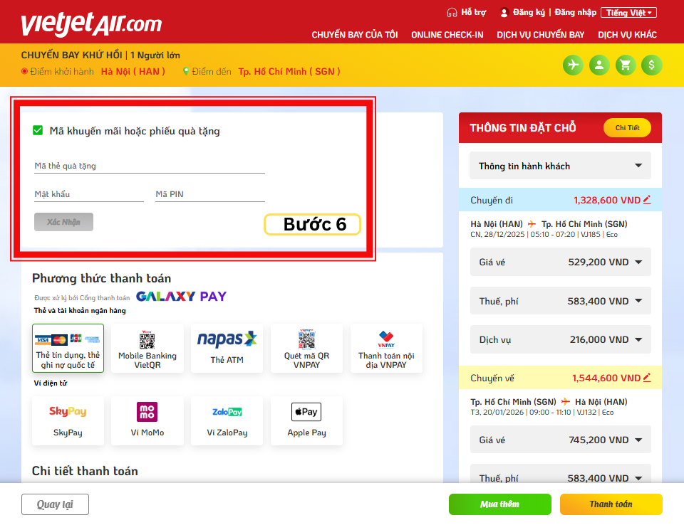 Chọn phương thức thanh toán và Thanh toán số tiền còn lại sau khi áp dụng voucher. Tham khảo thêm về cách thanh toán tại link: https://www.vietjetair.com/vi/pages/kenh-thanh-toan-1578483531654