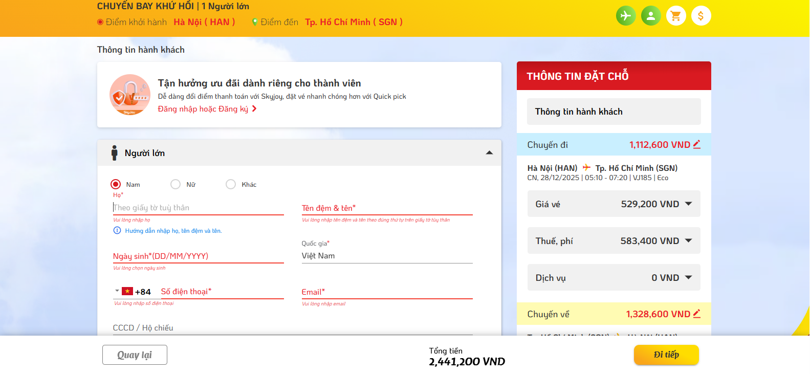 Với bước này, bạn cần điền thông tin hành khách chính xác. Tốt nhất, bạn nên điền thông tin theo CMND/CCCD để tránh sai sót.