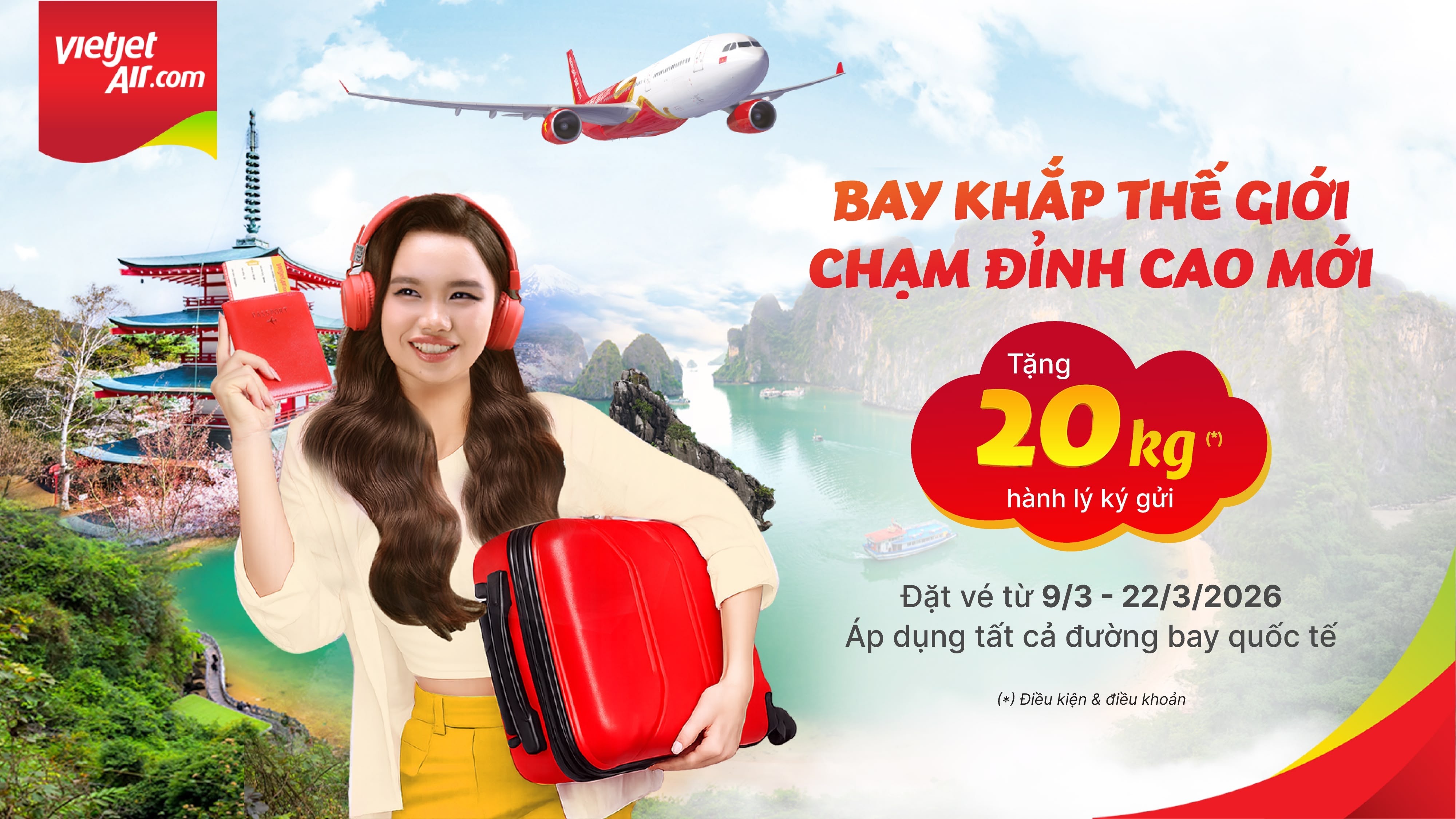 (Vietjet, TP.HCM, ngày 05/03/2026) – Rộn ràng tháng 3 ngập tràn ưu đãi, cùng với khuyến mãi giảm tới 83% giá vé dịp 8/3, Vietjet tiếp tục dành tặng người dân và du khách 20kg hành lý ký gửi miễn phí cho các chuyến bay thẳng giữa Việt Nam và quốc tế. Ưu đãi mới áp dụng khi đặt vé tại www.vietjetair.com hoặc ứng dụng di động Vietjet Air từ 09/03 đến 22/03/2026 (GMT+7), với thời gian bay linh hoạt từ 01/04 đến 01/08/2026 (*).