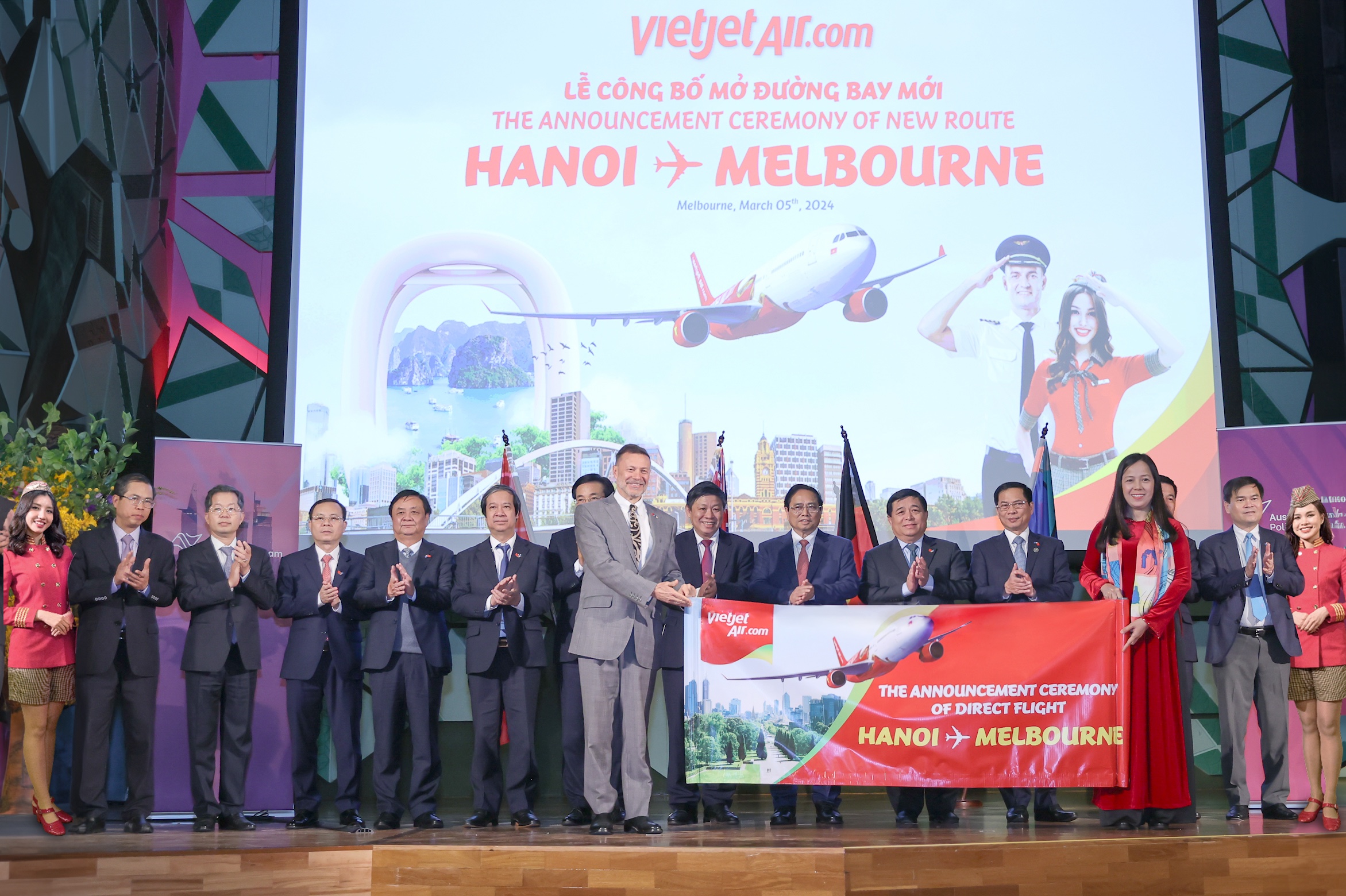 Thủ tướng Chính phủ Phạm Minh Chính, Thủ hiến bang Victoria bà Jacinta Allan cùng lãnh đạo cấp cao hai nước chúc mừng và chào đón đường bay mới của Vietjet ngay tại sự kiện có ý nghĩa quan trọng với cộng đồng doanh nghiệp Việt Nam - Australia nhân chuyến thăm chính thức Australia của Thủ tướng Chính phủ Phạm Minh Chính.