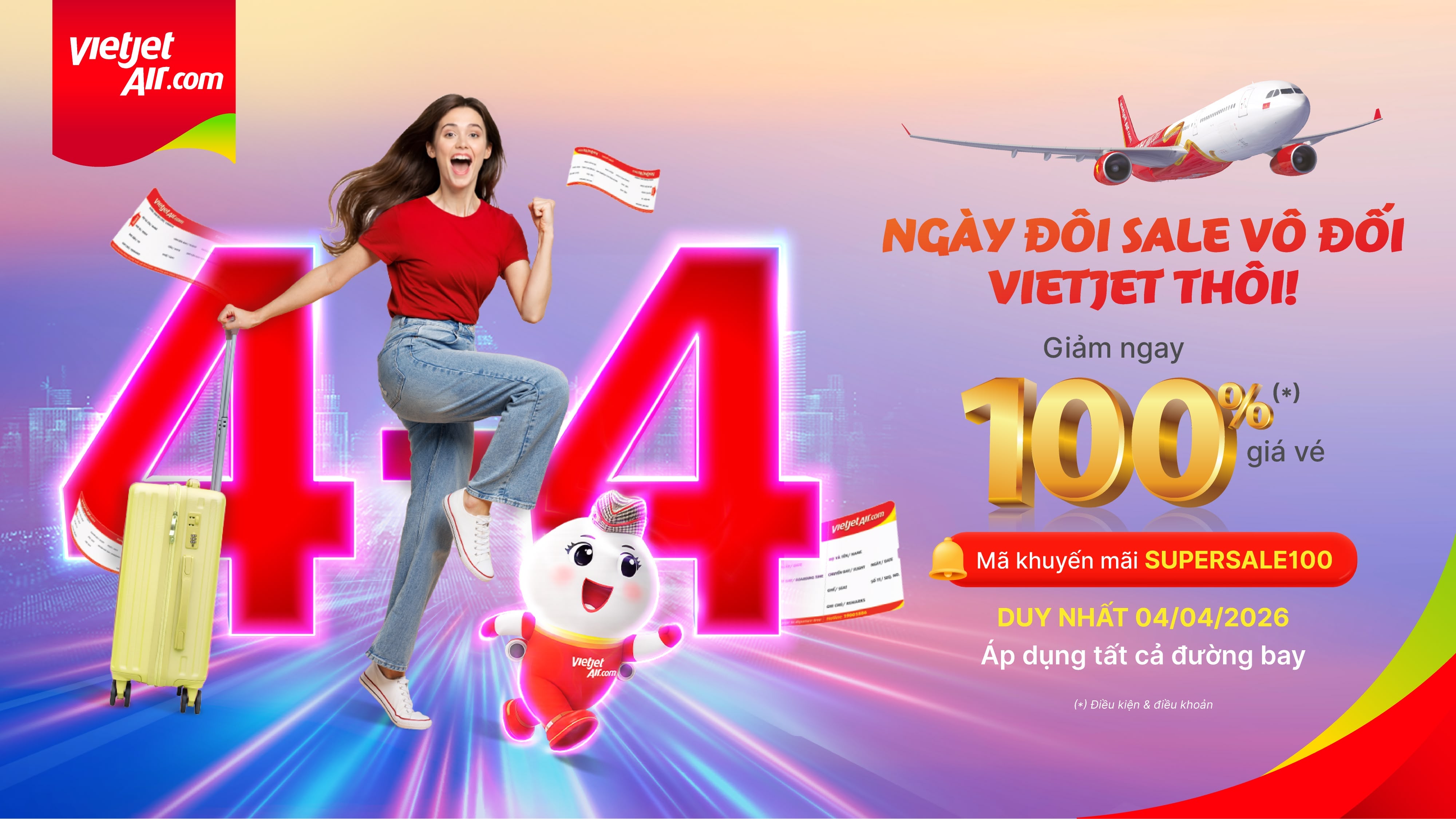 Theo đó, từ 00h00 đến 23h00 ngày 04/04/2026 (GMT+7), hành khách nhập mã SUPERSALE100 khi đặt vé Eco tại website www.vietjetair.com, ứng dụng Vietjet Air sẽ được giảm tới 100% giá vé (chưa bao gồm thuế, phí), áp dụng cho tất cả các đường bay mà hãng đang khai thác.