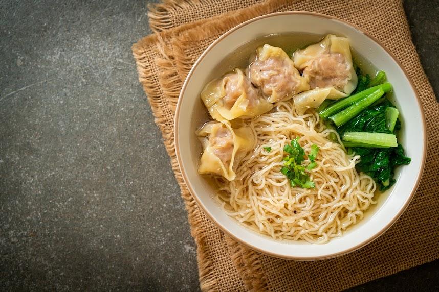 In Guangzhou, wonton noodles are mainly made from shrimp and minced pork served with a broth containing rich spices and green vegetables.