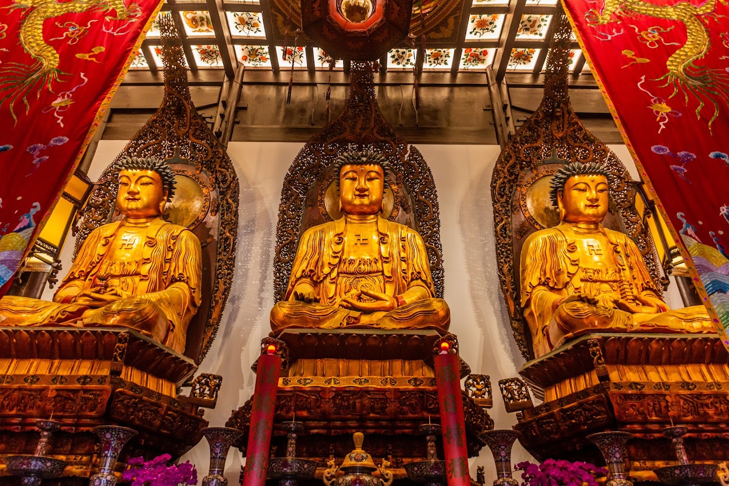 The center of the main hall enshrines three gold-plated Buddha statues, majestic and resplendent.