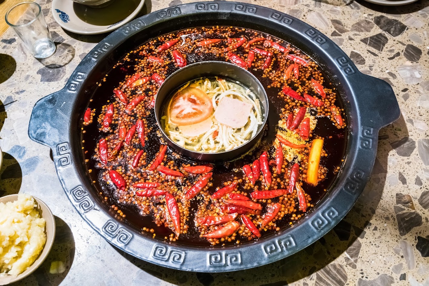 Sichuan Hotpot: Renowned for its explosively spicy flavor, the Sichuan hotpot delights diners with its rich broth infused with fresh ingredients like beef, seafood, and vegetables. The broth, made from bones and blended with Sichuan peppers, star anise, cinnamon, and cardamom, creates an irresistibly spicy and aromatic flavor.