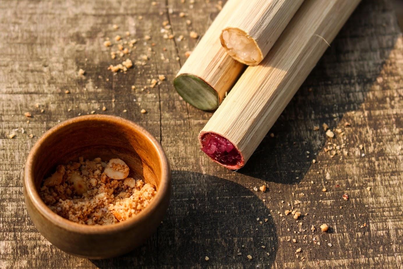 竹筒烤榄饭,沾芝麻盐吃,是一道东北山林特色菜肴。