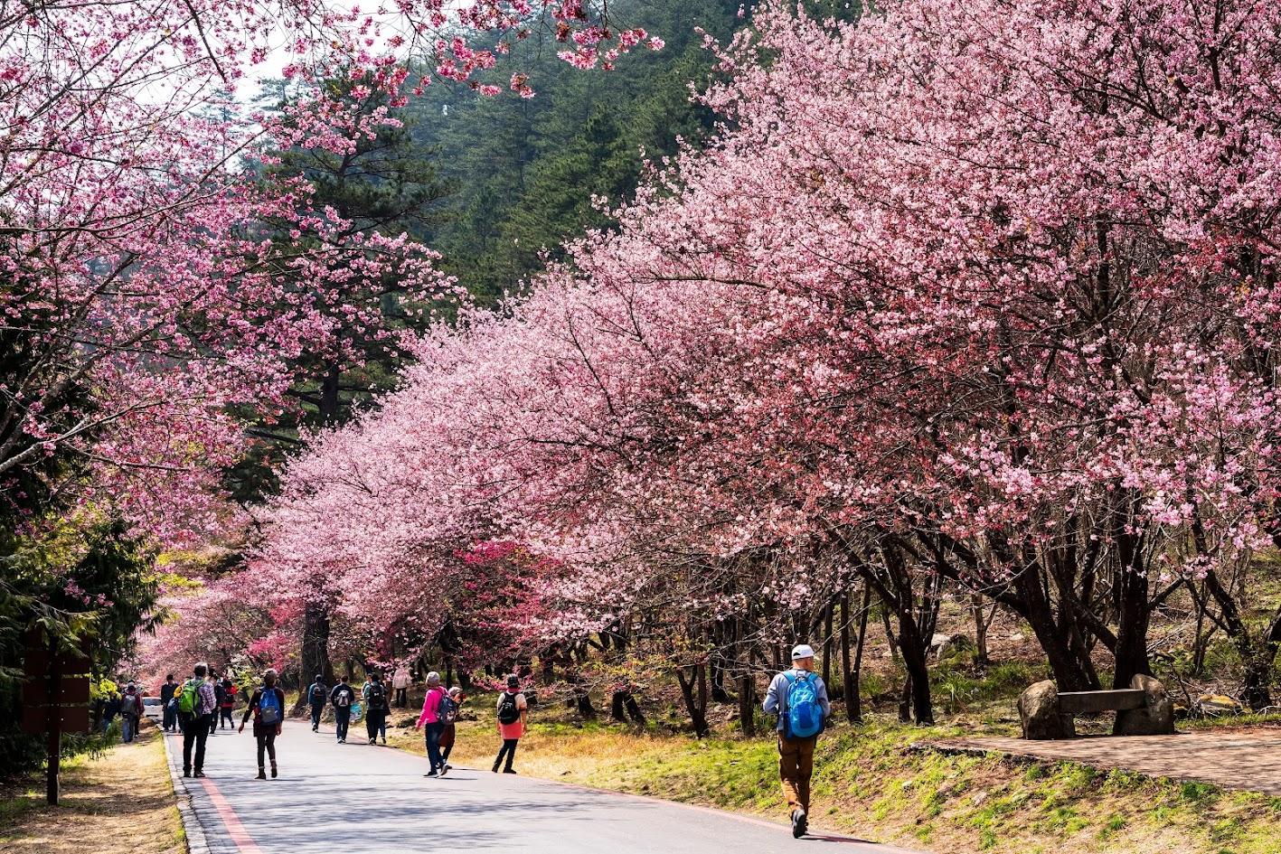 春天到來的時候,武陵農場的街道上開滿了粉紅色的櫻花,吸引遊客。